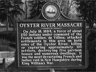 during King William's War, a force of about 250 Indians under the command of a French Soldier, de Villieu, attacked settlements in this area on both sides of the Oyster River, killing or capturing approximately 100 settlers, destroying five garrison houses and numerous dwellings. It was the most devastating French and Indian raid in New Hampshire.